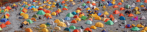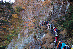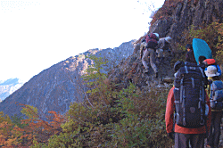 | 2008.10.13(3日目) 3日目の朝も、綺麗な星空。 オリオン座が明け方の空に溶け込むように消えていくと、モルゲンロートの世界が広がる。 今日も天気がよさそうだ。 朝ごはんは、残りご飯をお粥にして卵スープの素を混ぜたもの。 それでも食べ足りないので、ラーメンも作って一人前を半分づつ食べる。 テン場まで陽が入ってこないうちにパッキング終了。30分のトイレ待ちを終えて、出発。 帰りは屏風のコルを経由して新村橋へと下山するパノラマコースを選択する。 案内看板には、健脚向きコースと書いてあるので、「私、健脚かなぁ」って悩んだ方は、歩かないほうが賢明です。 しばらくは、紅葉の写真を撮りながら快適に歩いていたけれど、尾根を回り込むと目の前には長蛇の列が。 ここからは何箇所か鎖場があって、大渋滞を引き起こしているらしい。 列は全然動かない。いったい先頭はどうなってんの?? まさか山の中で、USJ並みの行列を見るとは思わんだ。(※関東の方は、「まるでディズニーランドだね」って仰ってました) 日陰の狭い登山道でじっとしているので、体がこわばる。槍の穂先も見飽きた。 しまいには、痺れを切らして涸沢へ戻っていくパーティも出だした。ざわめく一同。 稜線が近づいてきて、もうこれで最後かなって思いながら尾根を越えると誰も居ない。 目の前の最後の鎖場を下ると、さきほどまでの渋滞があっけなく解消されていた。 結局、屏風のコルにはコースタイムの倍以上掛かってしまった。 下山時刻が気になるので、休憩も少しだけ。 |