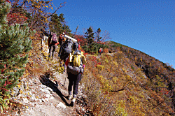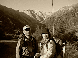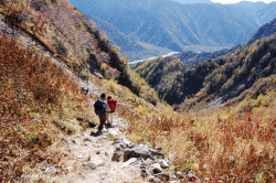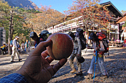 ここからは、ゲキ下り。痛む右足をかばいながらゆっくりと降りる。 おかんは、下りは調子が良さそうだ。 ペースメーカー代わりにあとを付いて行くが、なかなか下り応えのあるルートだった。 奥又白谷の出合で大休止。梓川が近づいてくるとほっとする。 徳沢園では、遅いお昼ご飯を時間を掛けて食べる。 一昨日に見た綺麗なカツラの紅葉は、跡形もなく散っていた。 ここからは、平坦な道やけれど、左足に大きなマメができて辛い。 明神館では、ベンチに座り1個200円の林檎を頬ぼる。 目の前には、明神岳が横からの光を受けて急峻な尾根を浮かび上がらせている。 林檎の甘みが、口腔から、食道から、そして胃袋からじんわりと体中に広がる。 思いのほかボリュウムのある林檎を食べ終える頃には、元気が湧いてきた。 さぁ、上高地まであと少し。重い腰を上げて夕日の中へ歩き始めた。 |